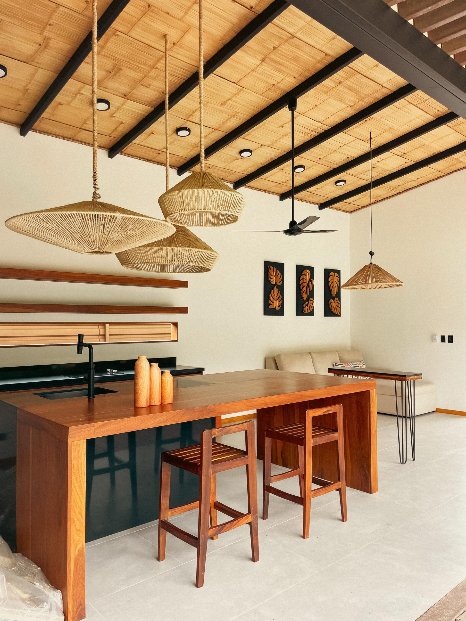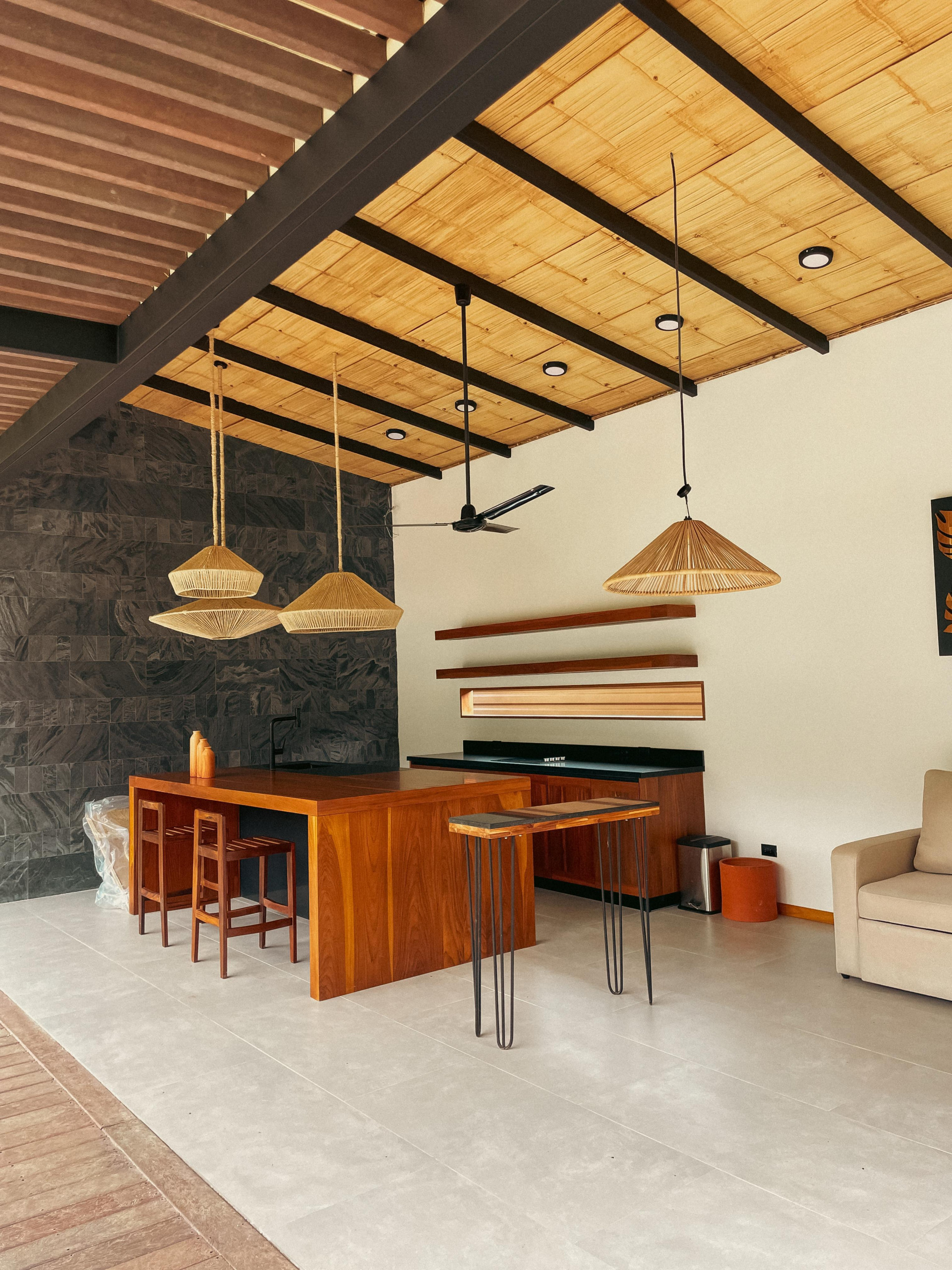 El bungalow fue diseñado con un estilo minimalista pero con un toque caribeño combinando madera y concreto de manera consistente y fresca.