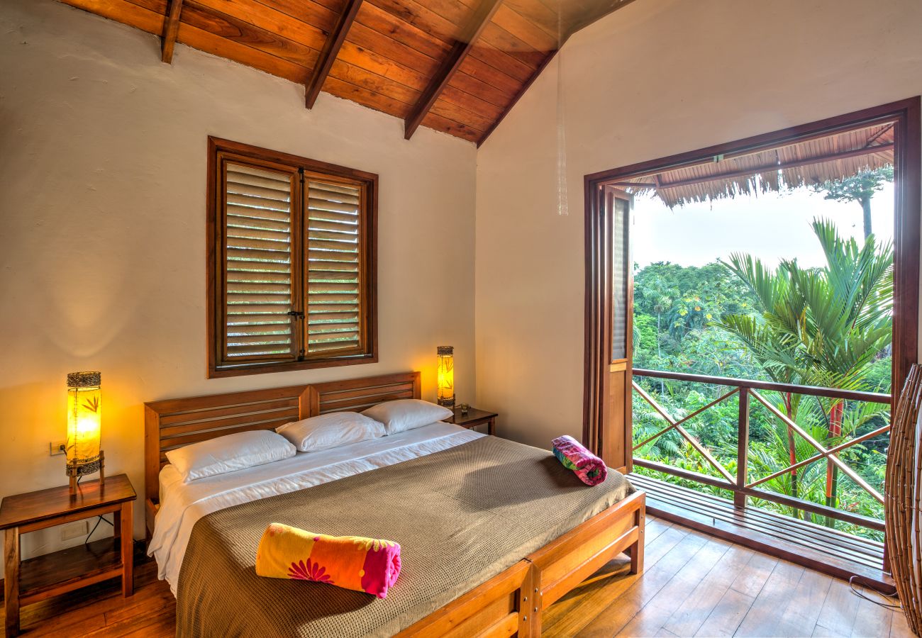 El dormitorio principal incluye una cama tamaño Queen y el segundo dormitorio tiene 2 camas individuales, perfectas para niños, o se puede convertir en una cama tamaño king grande. Cada habitación tiene su propio balcón privado con vista a la selva tropical y amplios baños exteriores al aire libre. Los pisos y los techos estilo catedral están hechos de hermosas maderas duras locales.