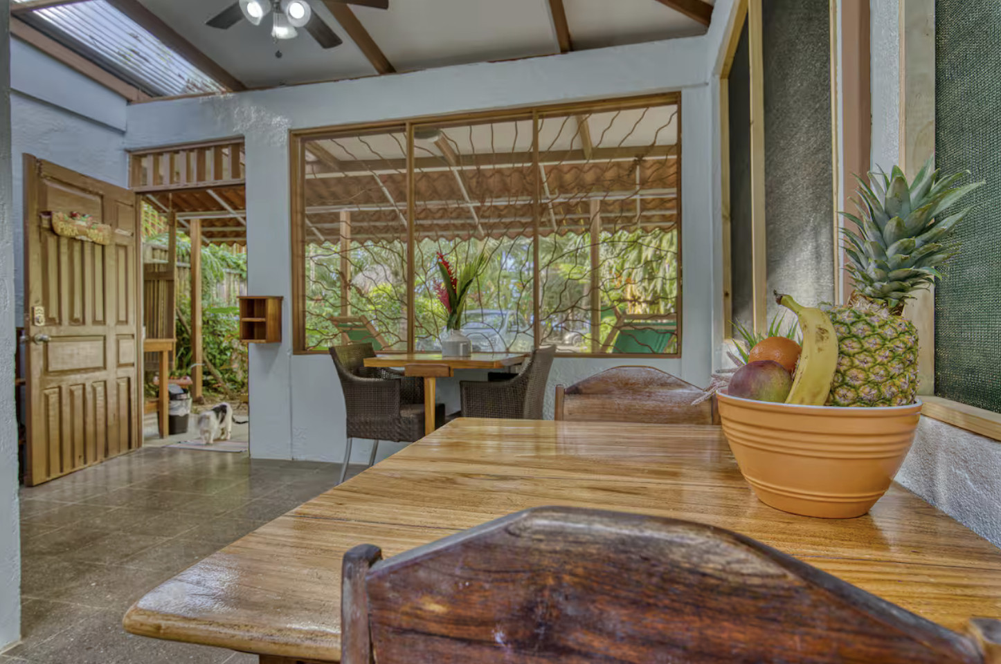 Disfruta del hermoso porche que rodea la casa, completo con hamacas, mecedoras y un juego de patio para relajarte y disfrutar de las vistas a la jungla. La sala de estar ofrece un espacio acogedor con TV para descansar después de un día en la playa.