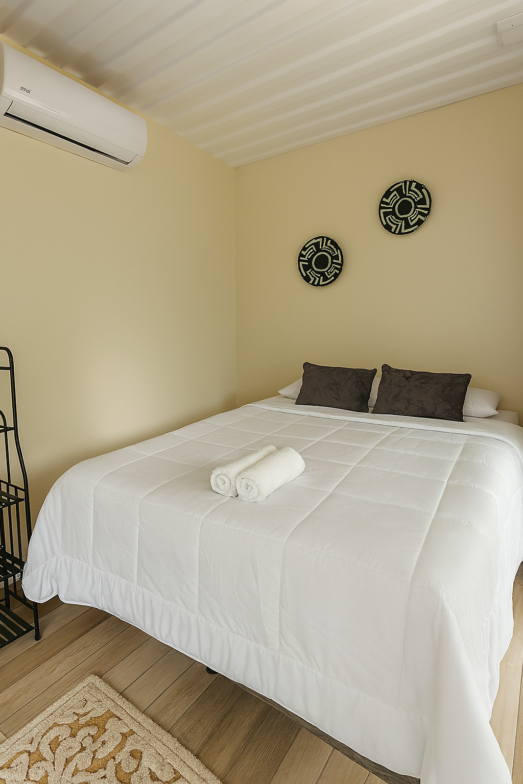 La chambre offre un lit spacieux et confortable, la climatisation et des détails décoratifs qui apportent chaleur et style.