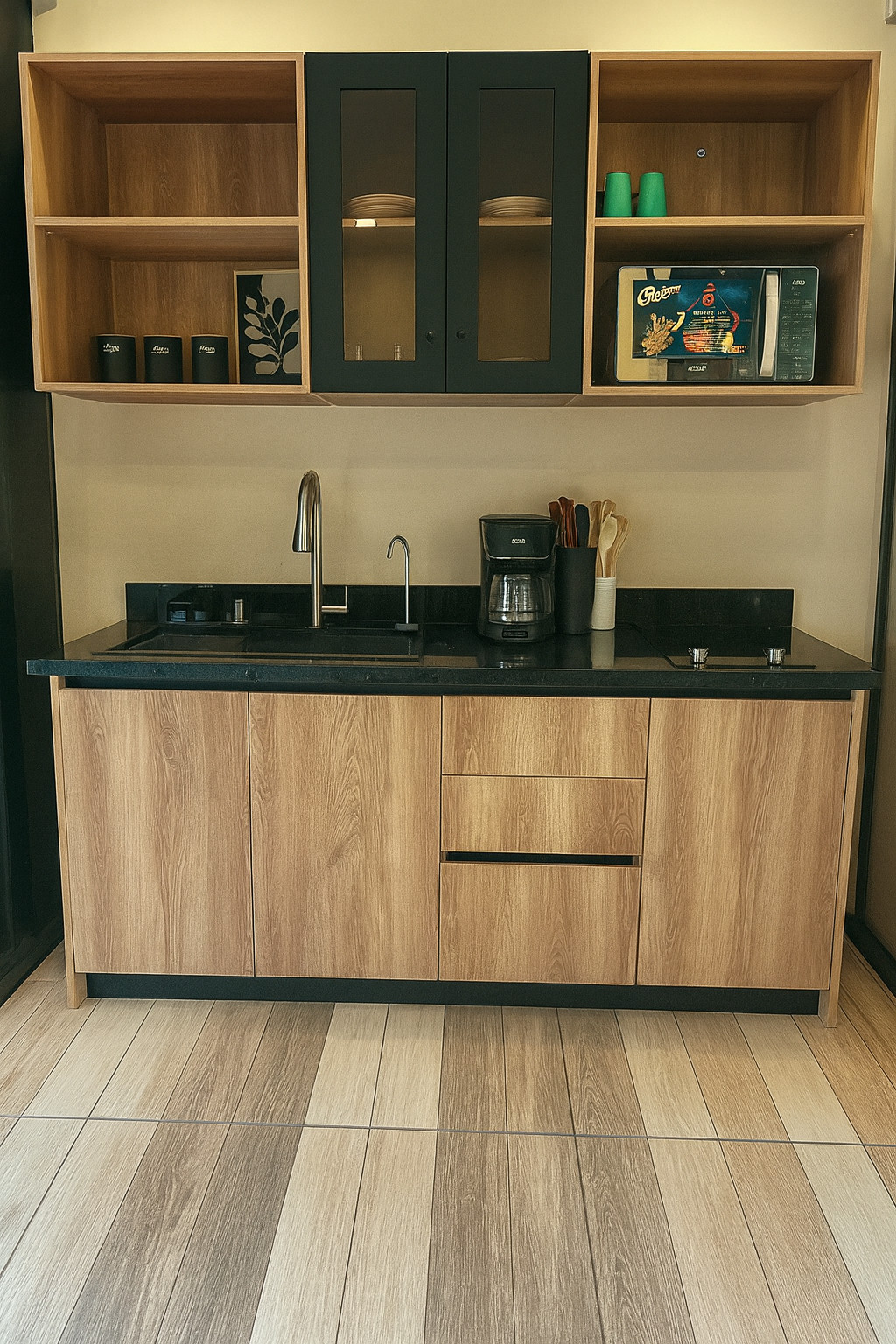 La cuisine est entièrement équipée pour préparer vos repas, avec des meubles modernes, des appareils essentiels et une distribution fonctionnelle.