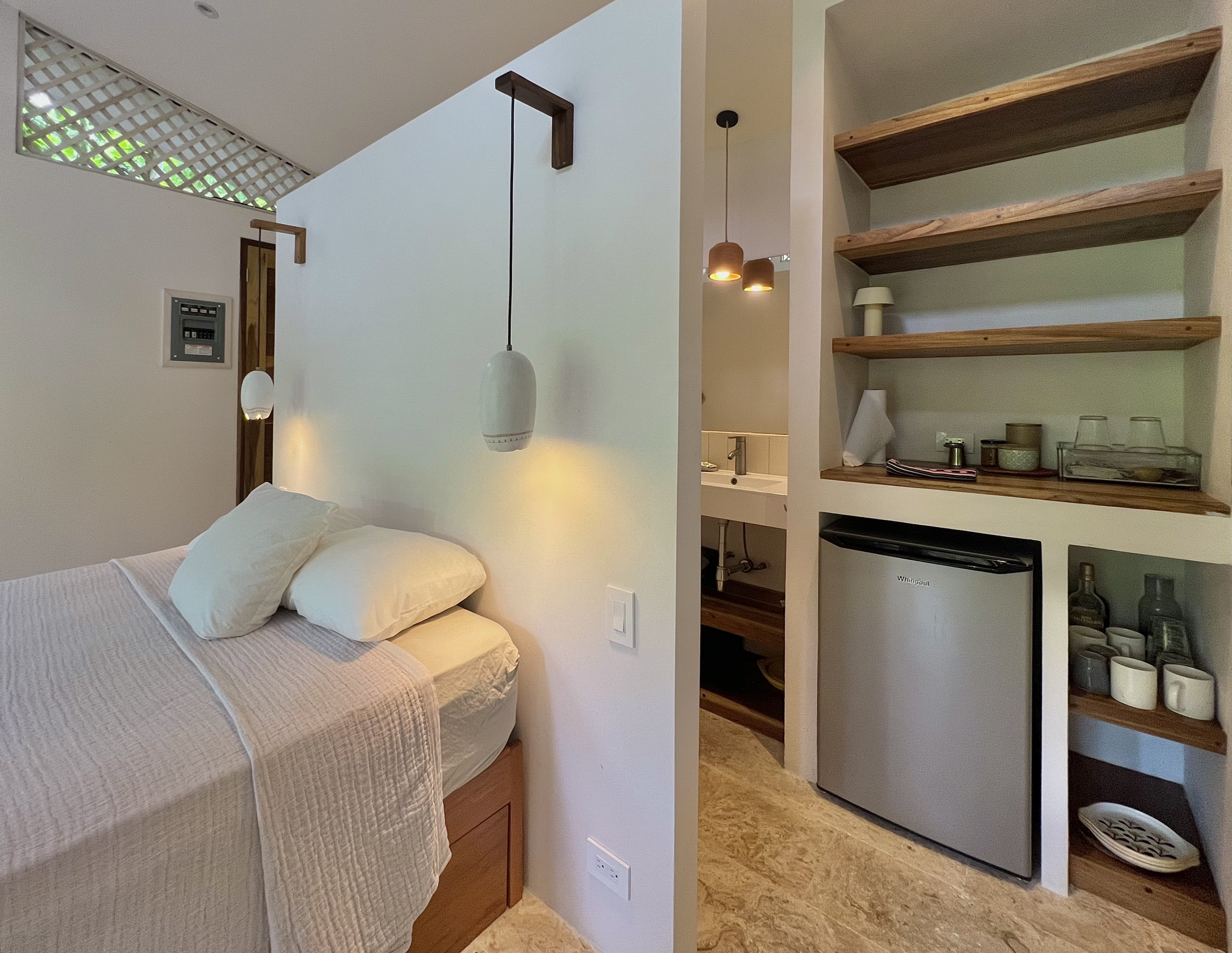 • A queen bed with a pull-out twin bed (perfect for 2–3 guests)
