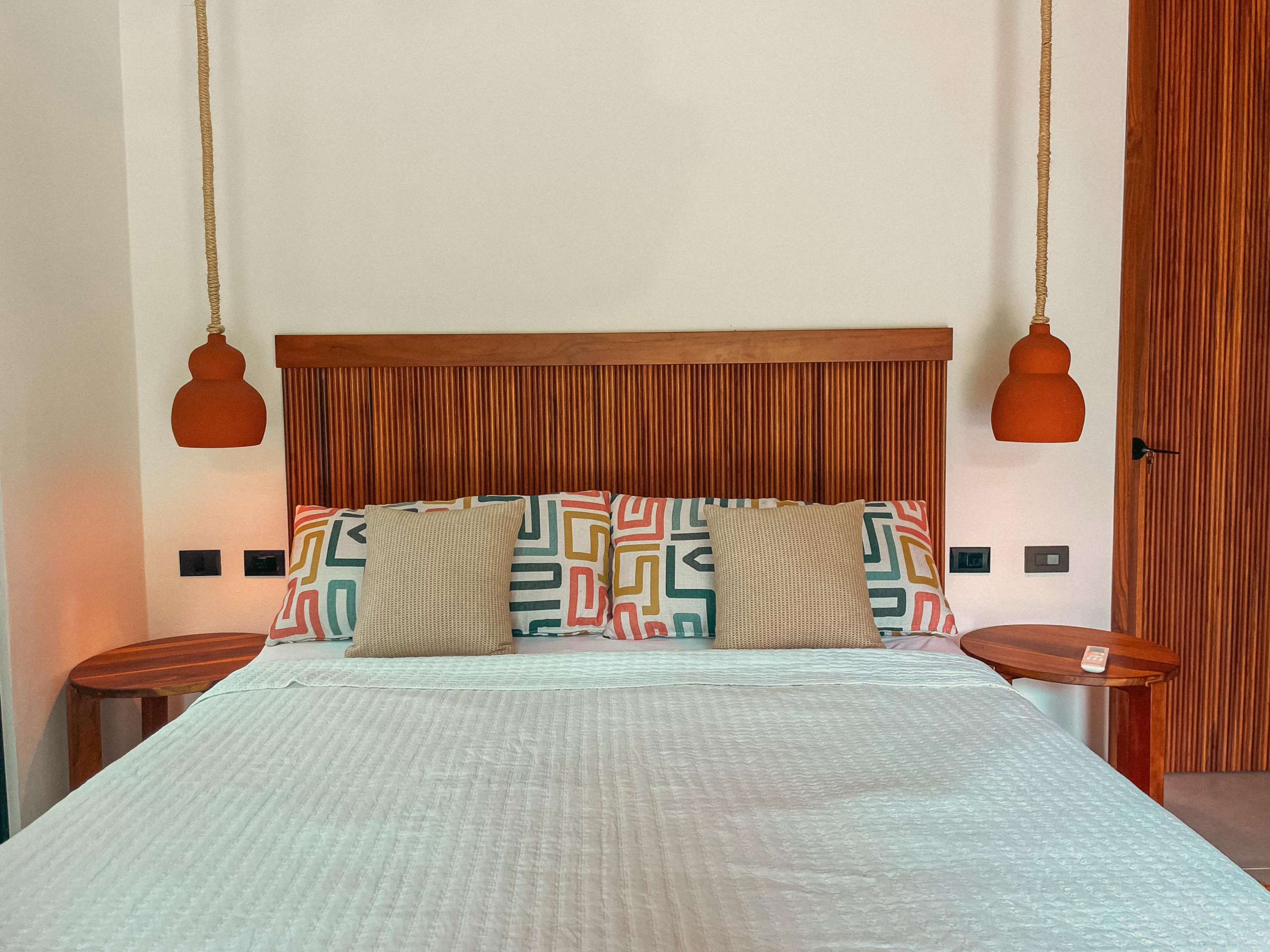 The bungalow consists of an open-style living room, combined with a fully equipped kitchen, all open with views of the beauty and freshness of the garden and pool. There is no air conditioning, but the cool breeze and the fans far outweigh this little detail which is not surprising at all.
